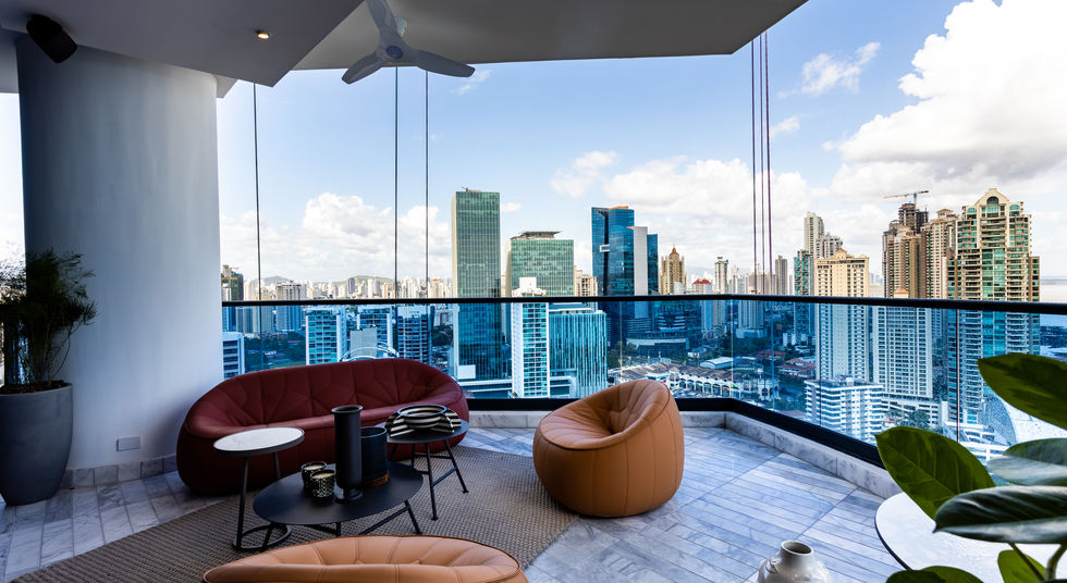 Lobby con ventanales de piso a techo en donde se puede apreciar la vista panorámica del mar